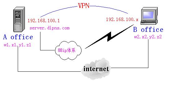 比如你的公司有A,B两地点。其中A是总部,B是分部。我们就把总部的ADSL虚拟拨号机器叫vpn server,我们把B分部的虚拟ADSL拨号的机器叫做vpn client。 首先把vpn server的本地连接的ip设置为:192.168.100.1。在vpn server上建立一个分配IP段为192.168.100.50--192.168.100.250的dhcp server(其他IP留给静态地址服务器用)。 在vpn server的机器上使用88ip服务,域名假设为server.dipns.com,当vpn server拨号连接上internet后,将获得一个公网IP为w1.x1.y1.z1(注意:没有公网IP将不能作为vpn server端),88IP体系自动将域名“server.dipns.com”解析到vpn server最新的IP地址上。 在vpn server上添加一个允许拨入的vpn连接,帐户:boffice,并设置为允许拨入。 在vpn client拨入internet后,就可以在vpn虚拟拨号中,用“server.dipns.com”去呼叫vpn server,并且用boffice这个帐户及密码的拨入vpn server。这个时候,vpn client将从vpn server上获得一个192.168.100.x的IP。这样的话,A和B之间的vpn连接就已经建立去来,可以象局域网的方式互相访问了。 提示:其中所有的参数是以举例子的方式给出,用户可以根据本身的情况进行修改或者直接采用上述方案。